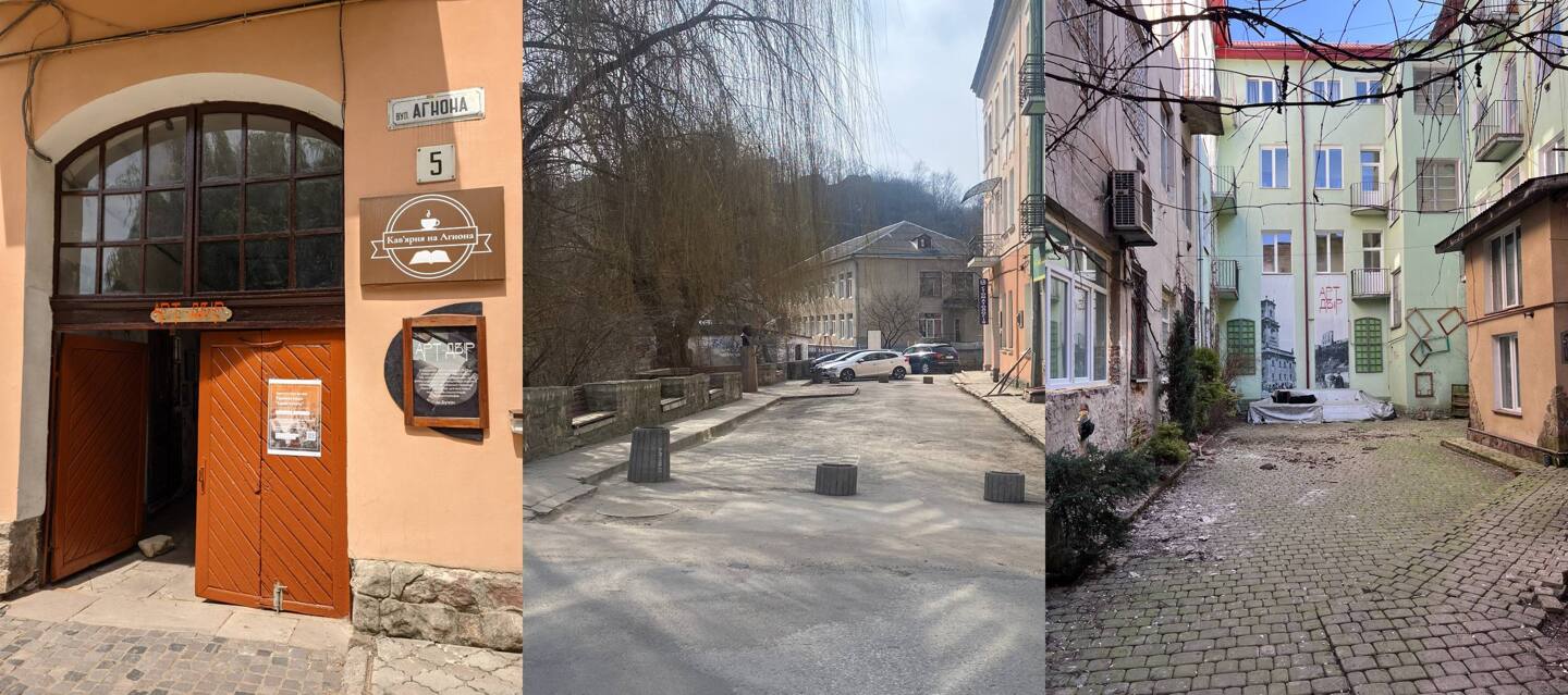 На фото: вхід (відновлений у 2025), пішохідна вул. Аґнона та основна площа Арт-Двору (2026)